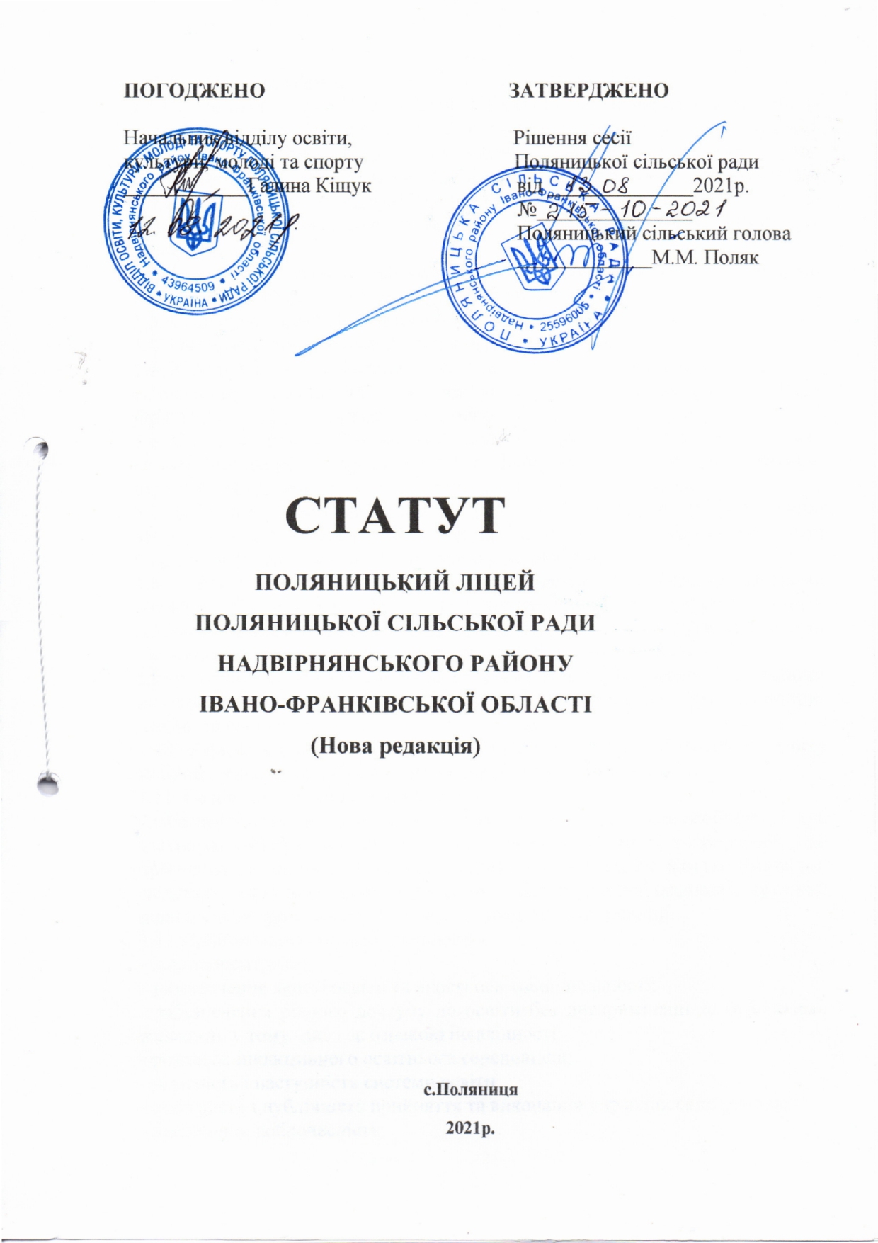 1.9. Засновником ліцею є Поляницька сільська рада Надвірнянського району Івано-Франківської області , уповноважений орган – Відділ освіти, культури, молоді та спорту.